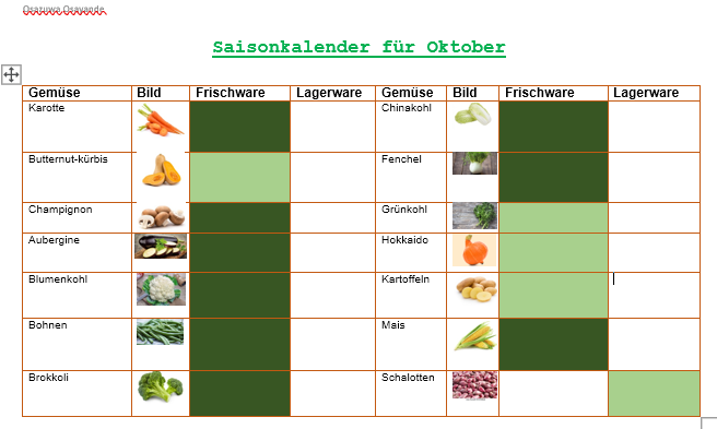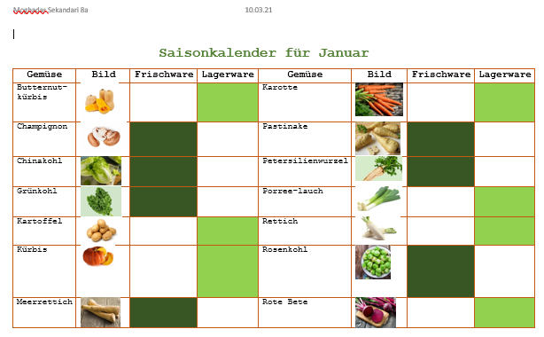 Vor dieser Frage standen die SchülerInnen der 8a im Distanzunterricht Soziales bei der Aufgabe, am PC einen Saisonkalender zu gestalten. Jede/r SchülerIn war für einen eigenen Monat verantwortlich, die Kenntnisse im Umgang mit Word wurden aufgefrischt. Dazu erstellten die SchülerInnen eine Tabelle, fügten Bilder ein und formatierten Spalten und Begriffe. Zum anderen erfuhren sie aber auch, welches Gemüse in den betreffenden Monaten als Freiland- oder Lagerware in den Geschäften erhältlich ist.