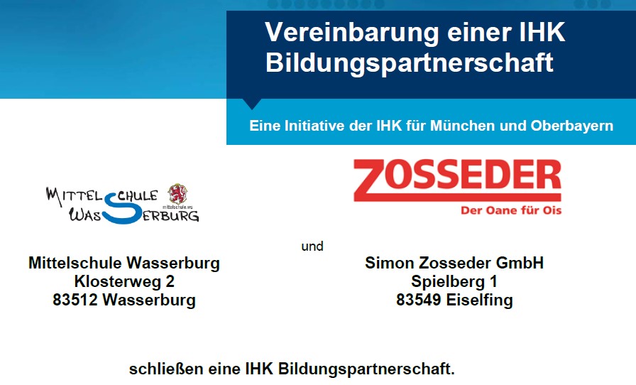 Im Landkreis Rosenheim gibt es eine weitere, neu geschlossene IHK Bildungspartnerschaft: Die Mittelschule Wasserburg und die Simon Zosseder GmbH in Eiselfing werden in Zukunft gemeinsam Schülerinnen und Schüler auf das Berufs- und Arbeitsleben vorbereiten. Beide Seiten haben eine entsprechende Vereinbarung geschlossen. Geplant sind unter anderem Führungen durch das Unternehmen, Betriebspraktika, Bewerbungstrainings und Besuch von Auszubildenden sowie deren Ausbildern im Unterricht.