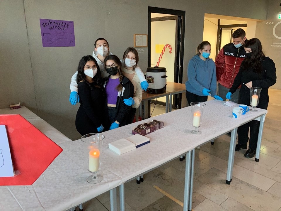 Unsere Schüler verkauften somit die Leckereien an ihre Mitschüler. Der Stand war sehr beliebt und die bewirteten Schüler kamen mit dem Servieren kaum hinterher. Zwischen den zwei großen Pausen mussten die Tassen wieder gespült werden. Dies erledigten die Schüler aus der Klasse von Herrn Waldecker. Die Klasse 9a war somit eine große Hilfe für alle. Ein großes Dankeschön ist auch an Frau Altinger auszusprechen, die für das Wechselgeld sorgte und uns so kräftig unterstütze. Ebenso möchten wir Frau Tica danken, da sie beim Abwasch und auch bei der Reinigung des Punschkochers half.