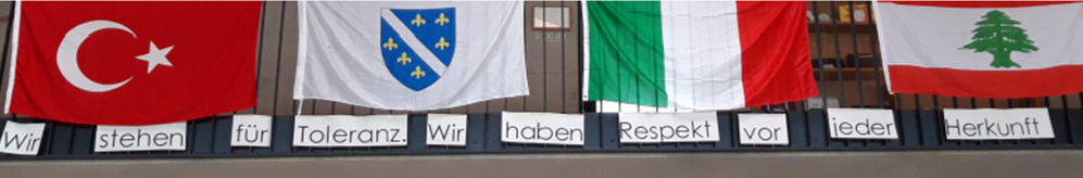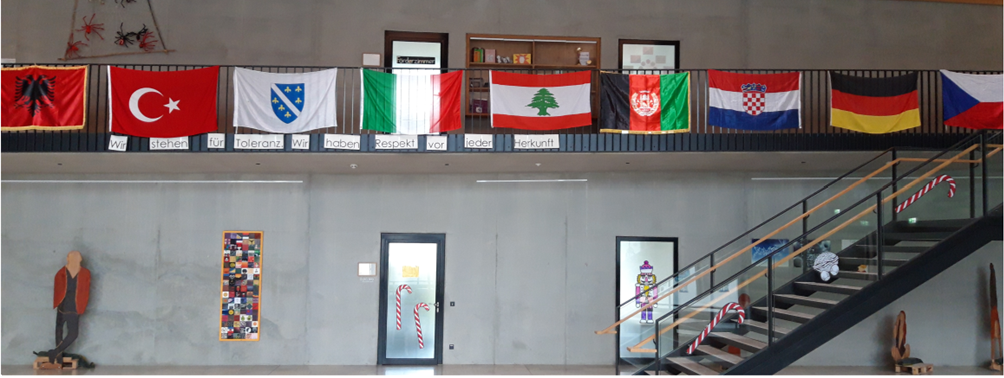 Dafür wurden von unseren Schülerinnen und Schüler Flaggen der Herkunftsländer gesammelt und aufgehängt. Darunter sind die Länder Albanien, Türkei, Bosnien, Italien, Libanon, Afghanistan, Kroatien, Tschechien und Deutschland. Das sind aber noch nicht alle und fast jeden Tag kommen neue Länder hinzu. Schön ist es, das Strahlen in den Augen der Schülerinnen und Schüler zu sehen, wenn sie ihre Flagge wiederfinden.