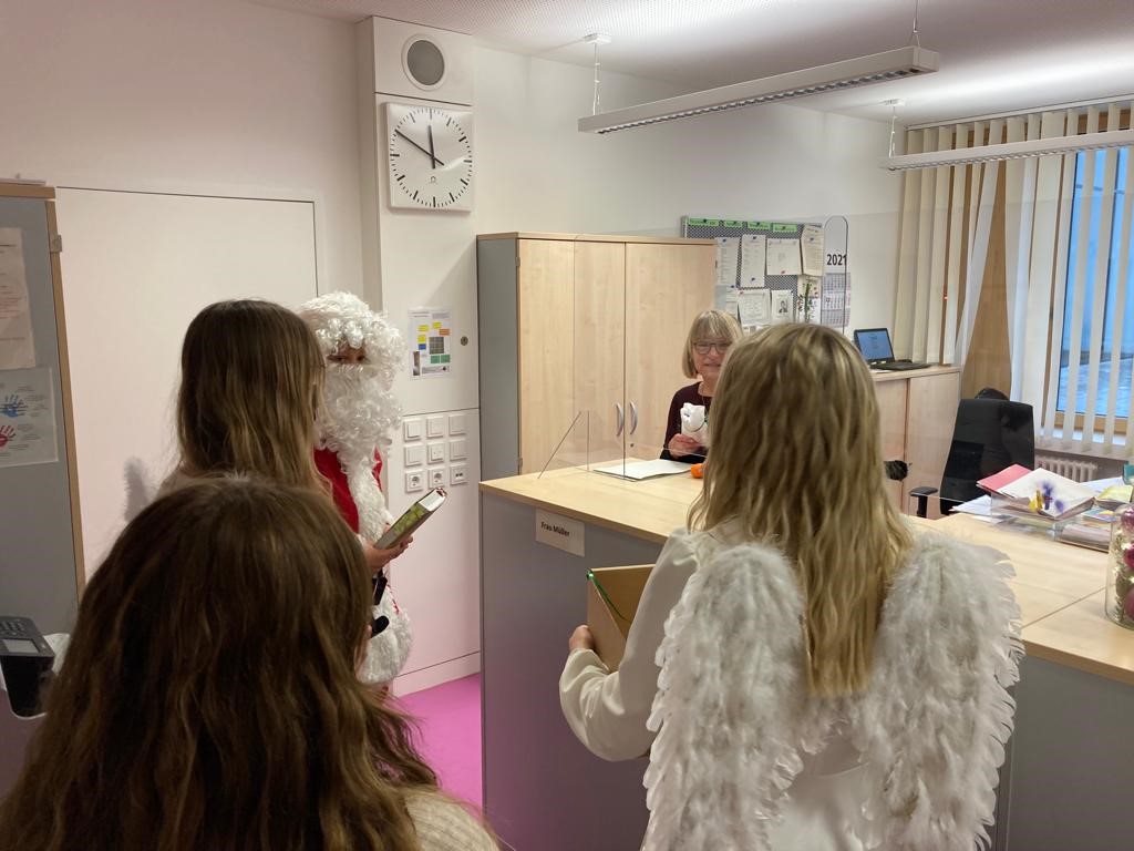 Und dann besuchten der Nikolaus und seine Engelchen noch Frau Müller im Sekretariat,…..