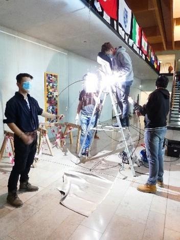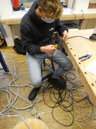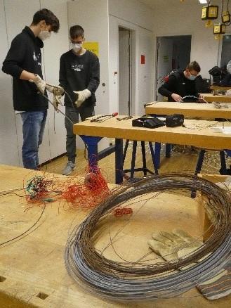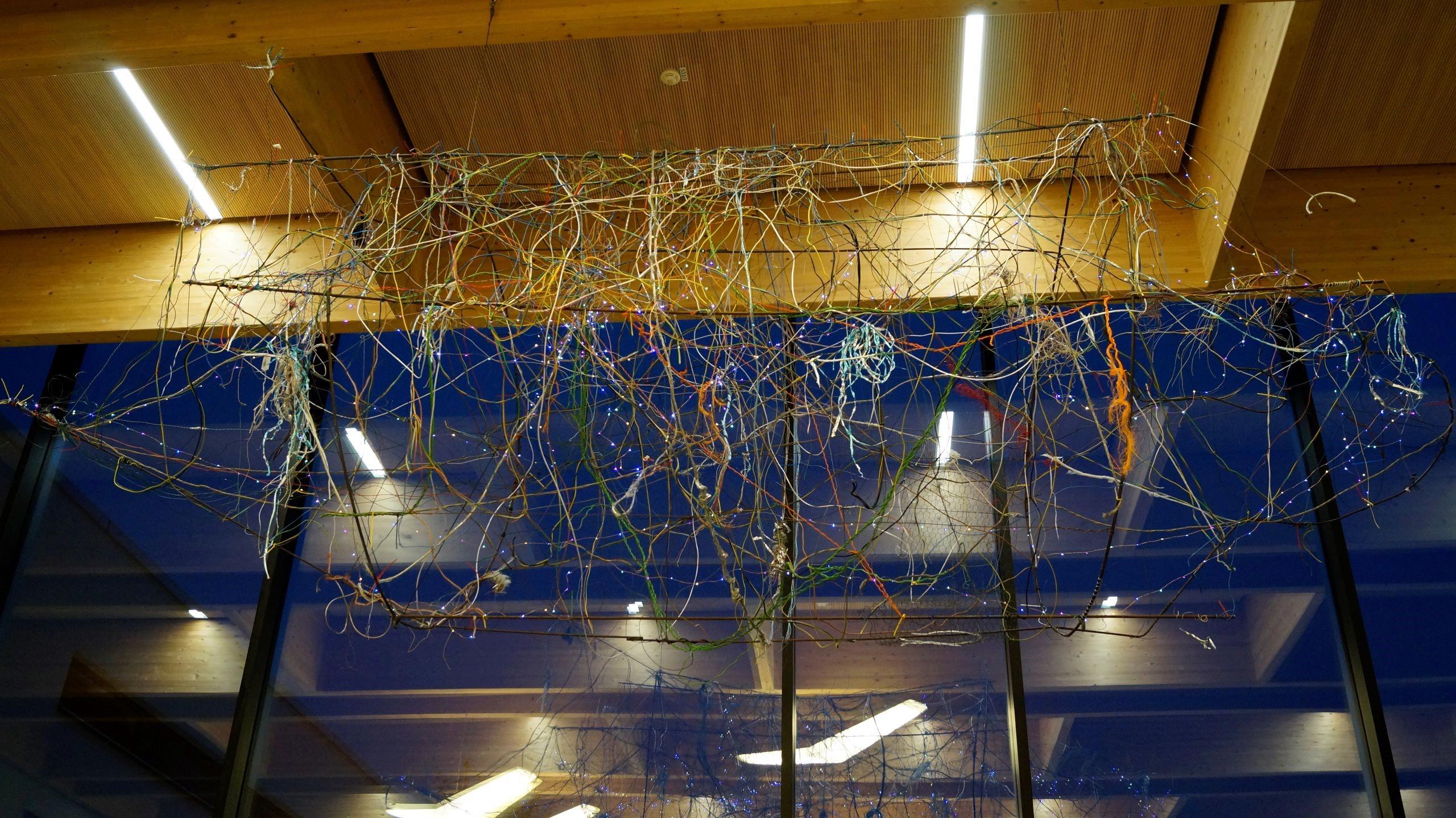 Auch alte Drähte und ein von den Schülern lackiertes Stahlseil wurden in die Installation eingearbeitet. Ein feines LED-Band lässt die abstrakte Installation als Lichtobjekt erscheinen. Wegen der Größe des Objekts mussten zum Schluss die Einzelteile in der Aula verschweißt und montiert werden.