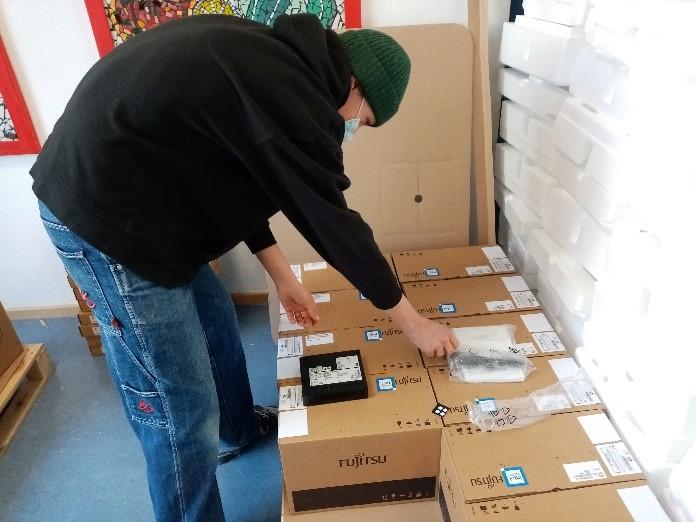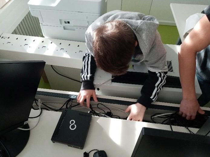 „Herr Stümpfl, da fehlt noch ein Netzwerkkabel!“, solche oder so ähnliche Sätze konnte man zwei Tage lang aus den PC-Räumen hören. Für die Schüler*innen der Praxisklasse ist es Ehrensache mit anzupacken, wenn sie um Hilfe gefragt werden. Und das hat Herr Stümpfl, der Konrektor unserer Schule, gemacht. So wurden an zwei Tagen zuerst die alten PC’s abgebaut und fein säuberlich geordnet in einen Lagerraum gebracht. Außerdem wurden die nun nicht mehr nötigen PC-Halterungen unter den Tischen abgeschraubt und im Keller verwahrt. Weiterhin mussten die Tische, die Kabelkanäle und die alten Computer gereinigt und desinfiziert werden. Die ca. 80 neuen Geräte wurden dann ausgepackt, aufgebaut und verkabelt.