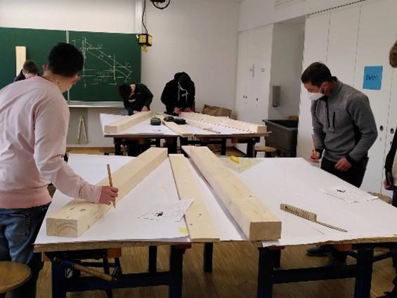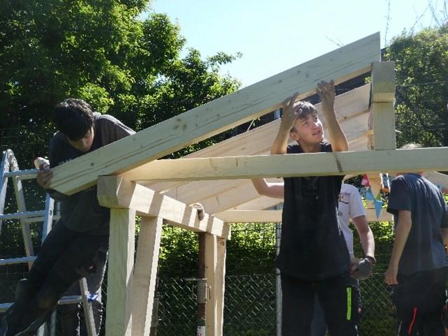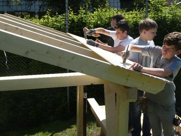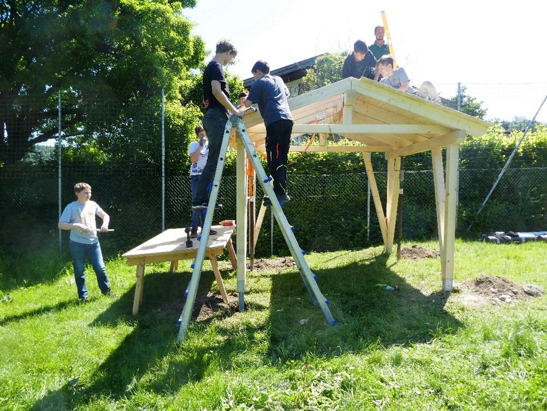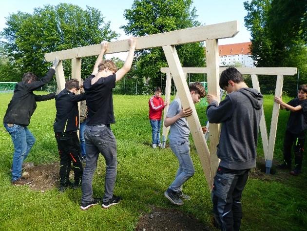 Der Zimmerer Martin Baumann von Huber & Sohn leitete die Technikgruppe von der Planung bis zur fertigen Holzkonstruktion gekonnt durch das Projekt. Im Werkraum wurden mit groben Sägen, Stemmeisen an den Balken die nötigen Holzverbindungen, z. B. Zapfenverbindungen herausgearbeitet und die nötigen Verbindungsbohrungen durchgeführt. Auf dem Außengelände wurden Fundamente für die Stahlschuhe betoniert, in welche die Rahmenteile maßgenau in Teamarbeit eingesetzt wurden.