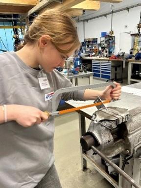 In der Metallwerkstatt durften die Techniker der Mittelschule einen massiven Klebefilmabroller aus Aluminium herstellen. Zuerst mussten sich die Schüler einen Überblick zur Fertigung anhand der technischen Zeichnung verschaffen. Die Form der Seitenteile wurde mit Anreißwerkzeug und Winkelmessern angerissen. Am schweren Maschinenschraubstock wurde dann mit der Bügelsäge das Material getrennt und exakt in seine Form gefeilt. Scharfe Kanten mussten entgratet werden. Nach der Oberflächenbearbeitung mit Stahlwolle wurden die Einzelteile zusammenmontiert.