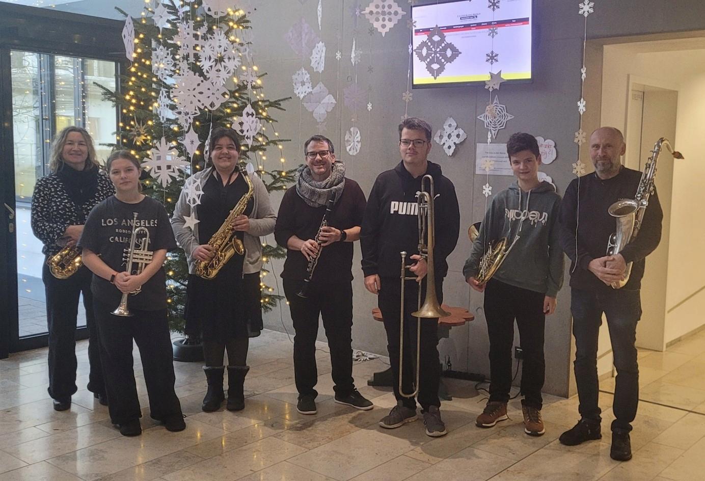 „Türen auf um 10 vor 8“ – mit dieser Anweisung spielt die Bläsergruppe der Mittelschule ein paar Minuten besinnliche Musik. Jede Klassenzimmertüre ist geöffnet und so zaubern die Musiker und Musikerinnen ein bisschen Adventsstimmung ins Schulhaus! Es ist ein kleines Innehalten und ein kurzes Durchschnaufen, ein Nachdenken und vielleicht auch ein wenig Kräftesammeln, bis es wieder hineingeht in den Schulalltag…
