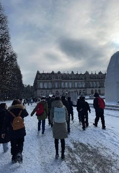 Mit dem Bus ging es früh am Morgen zum Chiemsee. Von dort fuhren wir mit dem Schiff auf die Herreninsel. Nun machten sich die Klassen auf den Weg zum Schloss Herrenchiemsee. Am Schloss angekommen, konnte man das beschneite Schloss Herrenchiemsee und den Schlossgarten bestaunen.